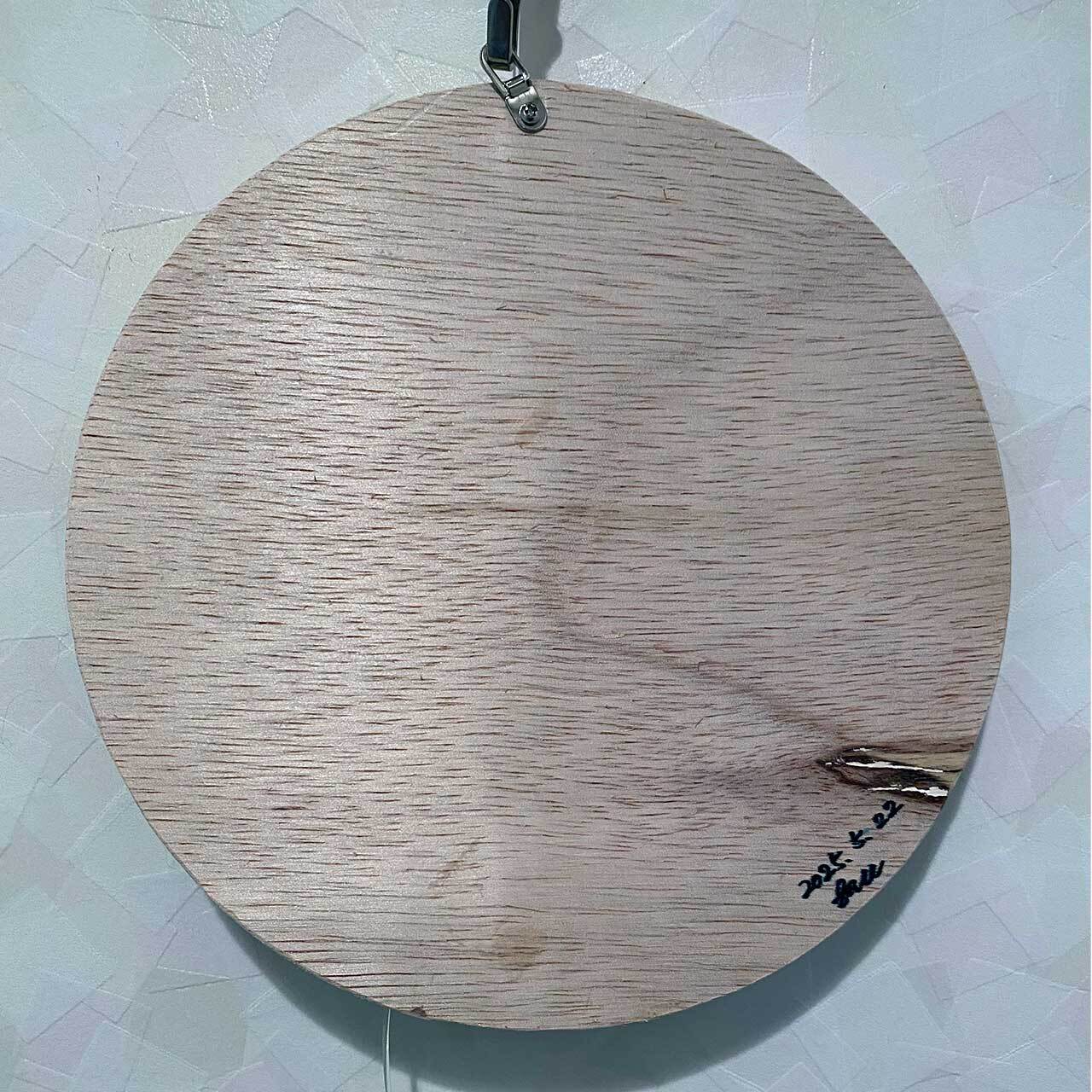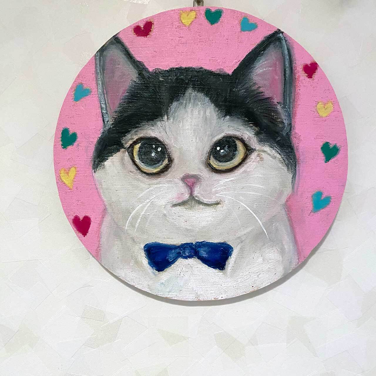 まんまるの木製ボードに、オイルパステルで描いた蝶ネクタイ猫の原画です。