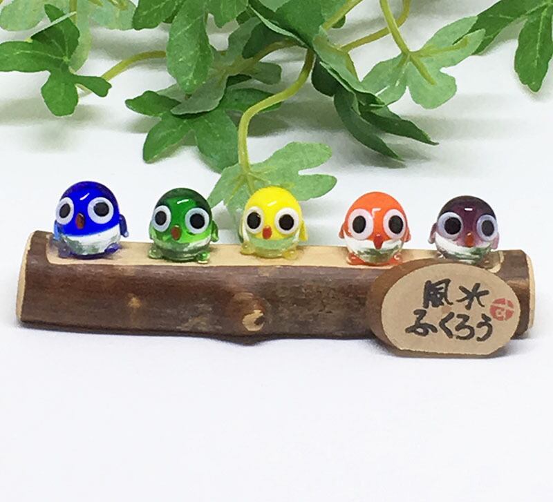 ひとつひとつ手作りされたミニチュアガラスのカードスタンド。幸せを呼ぶ5色のフクロウです。